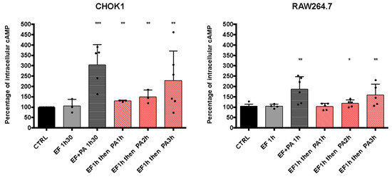 With regard to the increase in cAMP level in the different epithelial cell lines, the CHOK1 cell line was used since it was the most sensitive in our experimental conditions (Figure 9). The study was also carried out in the macrophages RAW264.7 cells. The commercial EF protein was used since it gave a higher cAMP response than EFvenus (Figure 9). CHOK1 and RAW264.7 macrophages were exposed for 1 h to EF (100 nM), washed to remove EF possibly bound to the cell surface, and exposed for 1, 2, or 3 h to PA (300 nM) (Figure 10). Under these conditions, the increase in cAMP levels was slight but significant for CHOK1 cells after 1, 2, or 3 h of subsequent PA exposure and for macrophages after 2 h and 3 h.