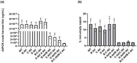 Figure 3a summarizes the impact of ITR deletions on crude harvest titers. The crude harvest titer of WT/WT was determined to be 3.79 ± 1.90 × 1010 vg/mL. The titers of vectors with A del/A del, WT/B del, WT/C del, WT/D del, and WT/B-C del ranged from 3.53 ± 1.27 × 1010 vg/mL to 5.185 ± 1.24 × 1010 vg/mL, which were comparable to WT/WT.