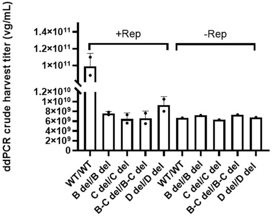 However, the titer of vectors with deletions in the C loop, B loop, and D sequence in both ITRs were determined to be 8.19 ± 0.728 × 108 vg/mL to 3.05 ± 1.07 × 109 vg/mL. These vectors exhibited a substantial 12- to 21-fold reduction in crude harvest titer compared to vectors with WT/WT ITRs. Remarkably, when both B loop and C loop were deleted from both ITRs, the vector’s productivity plummeted 46-fold.