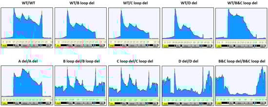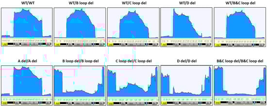 For the B loop deletion in one ITR, the packaged DNA reads also predominantly accumulated within the two ITR regions. However, the enriched read clusters were exclusively concentrated within the intact 5′ ITR region. Remarkably diminished sequencing depth was observed in the 3′ ITR region harboring the C loop deletion, in contrast to the GOI region. Notably, the extent of reads enrichment within the ITR region was lower than that observed in the wild-type design. Analogous outcomes were obtained for other single deletions within the 3′ ITR, such as the C loop deletion in one ITR (referred to as WT/C loop del) and the combination of B and C loop deletions in one ITR (referred to as WT/B and C loop del).