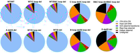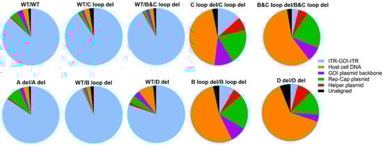 Obvious differences were observed for SPE samples with two deletion designs, those being C loop del/C loop del, B and C loop del/B, and C loop del, B loop del/B loop del, and D del/D del. The packaged GOI sequence was no more than 36.20%. For the B and C loop del at both ITRs, only 7.1% GOI was shown in all the particles. For these vectors, the majority of the packaged DNA sequence comes from the host cell genome and packaging plasmids.
