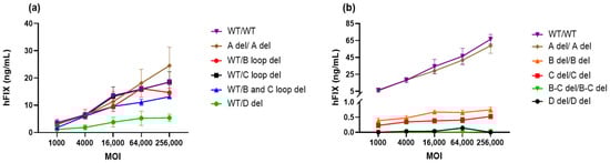 When AAV-DJ-hFIX vectors were generated from a GOI plasmid with an A region deletion in both ITRs, there was no remarkable difference in potency at any MOIs, except for the highest MOI of 25,600 vg/mL (Figure 9a). However, we observed a reduction in potency in cells infected with vectors carrying a D deletion in one ITR, when compared to the WT ITR. This reduction in potency was particularly evident at MOIs ranging from 4000 to 25,600 vg/cell. A one-way analysis of variance (ANOVA) was conducted to assess the significance of the difference between WT/WT (11.62 ± 6.31 ng/mL) and modified ITRs ranged from 12.67 ± 8.75 ng/mL to 3.48 ± 1.93 ng/mL, at the highest MOI (Figure 9a). Only WT/D del was found to be significant, * p < 0.05, which indicates that the D sequence plays a crucial role in the transduction process.