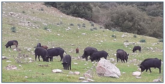 Most Greek organic pig farms are located in mountainous or semi-mountainous areas, which is why they do not have a thick layer of fat like other types of pigs. They are resistant to weather conditions and diseases. Conventional pigs give birth to 12–14 piglets, whereas indigenous Greek black pigs give birth to a maximum of 7. A conventional pig is utilized at the age of 5 months and weight of 110 kg, while an indigenous Greek black pig is slaughtered at 7–10 months of age, reaching a carcass weight of about 60 kg [14,15]. The animals give delicious pork meat and in some farms are fed with olives. When the genetic diversity, based on microsatellite analysis, of the Greek black pig was investigated, its genetic uniqueness was demonstrated. Despite their low population size, they have a high degree of genetic variability, which will be useful for breeding programs aimed at maintaining the long-term survival of this ancient breed [14,15].
