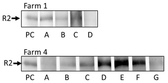 When sera from animals from farms 1 and 4 were analyzed in a Western blot using a recombinant C-terminal fragment of gB of PCMV/PRV, all tested animals were reacting positive (Figure 4). Some animals had a very faint reaction, e.g., animal D from farm 1 and animals A and G from farm 4. Animals D, E and F from farm 4 had a very strong reaction. The result is comparable with a Western blot testing of animals from a German slaughterhouse [28]. The R2 fragment was shown immunodominant in the gB protein [28] and gave similar results when compared with an ELISA using synthetic peptides corresponding to the R2 sequence [35,36]. Our Western blot assay was used repeatedly to determine the antibody response in different pig breeds [29,30].
