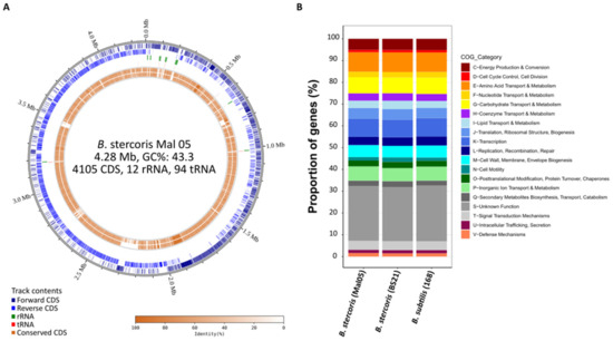 The B. stercoris reference genome BS21 was longer than the Mal05 genome (4.78 and 4.28 Mbp, respectively) and contained 4713 CDS compared to 4105 for Mal05. A pangenome analysis based on the distribution of orthogroups between the eight high-quality B. stercoris genomes that are currently available revealed that they shared 3320 orthogroups, while 118 orthogroups (i.e., 118 genes) were specific to Mal05 and absent from all other genomes. 44 of these 118 genes were organized into four gene clusters containing 5–17 genes each, albeit without any apparent functional enrichment within these clusters. Hence, despite being highly similar to the other B. stercoris genomes, the Mal05 genome also presented a few differences that set it apart. However, it has to be kept in mind that only one of the published genomes was complete (BS21). Therefore, it cannot be excluded that some of these genes are present in other sequenced B. stercoris strains, but that they were missed in the current genome assemblies. Moreover, the three genomes (Mal05, BS21, and B. subtilis 168) were very similar in terms of functional Clusters of Orthologous Genes (COGs) categories (Figure 1B).