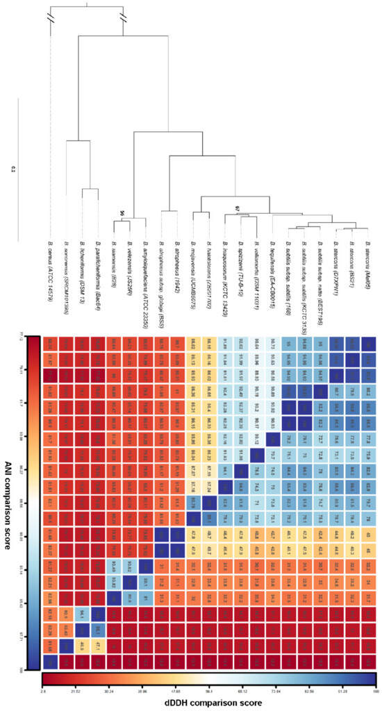 Phylogeny of the Bacillus subtilis group. Left panel: maximum-likelihood tree based on the concatenated amino acid sequence alignment of 954 single-copy orthologous genes from 19 reference genomes representing the different species and subspecies of the B. subtilis group with B. cereus as the outgroup. Only bootstrap values below 100 are indicated. Right panel: a matrix of the Average Nucleotide Identity (ANI) and digital DNA–DNA hybridization (dDDH) values between the different genomes is shown next to the tree. The color scale ranges from dark red (low-similarity values) to dark blue (high-similarity values).