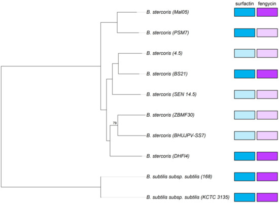 The presence of the two cyclic lipopeptides fengycin and surfactin has been suggested to be characteristic for B. stercoris and to distinguish it from other former B. subtilis subspecies that possess different sets of lipopeptides (i.e., surfactin alone, surfactin and iturins, surfactin, fengycin, and iturins) [25]. Unfortunately, only two of the eight B. stercoris genomes used in this study are currently complete. Therefore, the operons for fengycin (fenA-E) and surfactin (srfAA, srfAB, srfAC, srfAD, and sfp) biosynthesis are not completely present in all genomes. Notably, the genes srfAA and srfAB of the surfactin operon were fragmented in four of the eight genomes. The fragmented genes were at the extremities of contigs, suggesting that this was rather due to incomplete genome assemblies than being true pseudogenes. Similarly, the genes fenA, fenB, and in some cases also fenC of the fengycin operon were missing in five genomes, with the remaining two or three genes being located at the end of a contig. Consequently, only four genomes (Mal05, BS21, PSM7, and DHFI4) could be included in the subsequent analyses of the surfactin biosynthesis genes, and only three genomes (Mal05, BS21, and DHFI4) for the fengycin biosynthesis genes (Figure 3).