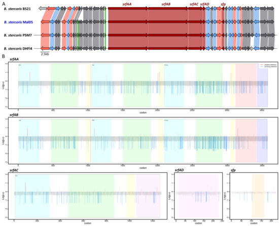 Synteny and evolution of the surfactin biosynthesis genes. (A) Synteny of the genomic region surrounding the surfactin biosynthesis genes. The five genes involved in surfactin biosynthesis are colored in dark red. Pink indicates genes involved in other biosynthetic processes, green indicates genes involved in regulation, and blue indicates genes involved in transport. Grey indicates genes involved in other processes. (B) Sites under selection for each gene. Blue indicates genes under purifying selection, red indicates sites under diversifying selection. Colored shading delimits the different functional domains in each gene. The x-axis reports the position of each site (i.e., codon) while the y-axis reports the log10 of the dN/dS ratio.