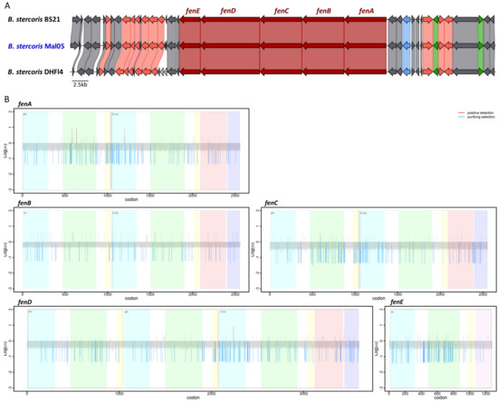 Synteny and evolution of the fengycin biosynthesis genes. (A) Synteny of the genomic region surrounding the fengycin biosynthesis genes. The five genes involved in fengycin biosynthesis are colored in dark red. Pink indicates genes involved in other biosynthetic processes, green indicates genes involved in regulation, and blue indicates genes involved in transport. Grey indicates genes involved in other processes. (B) Sites under selection for each gene. Blue indicates genes under purifying selection, red indicates sites under diversifying selection. Colored shading delimits the different functional domains in each gene. The x-axis reports the position of each site (i.e., codon) while the y-axis reports the log10 of the dN/dS ratio.