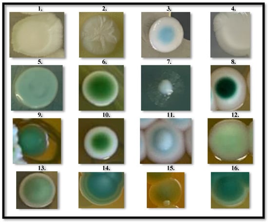 Yeasts colonies morphology. A total of 16 different morphologies of isolated yeast colonies, distinguished by color and topography: (1) Cream to light green/yellowish medium, Flat, surface: smooth/opaque; (2) White to cream/yellow medium, Convex, surface: wrinkled/opaque; (3) Light blue in the center/cream at periphery, Flat, surface: smooth/glossy; (4) White to cream/yellowish medium, Flat, surface: smooth/opaque; (5) Light green/yellowish medium, Flat, surface: smooth/glossy; (6) Intense green in the center/cream at periphery, Flat, surface: smooth/glossy; (7) Light green with thin hyphal-like ramifications/yellowish medium, Convex, surface: smooth/glossy; (8) Dark green in the center/white at periphery, Flat, surface: smooth/glossy; (9) Intense green/greenish medium, Convex, surface: smooth/opaque; (10) Intense green in the center/white at periphery, Convex, surface: smooth/glossy; (11) Intense white in the center/light green at periphery, Convex, surface: smooth/glossy; (12) Light green/yellowish medium, Flat, surface: smooth/glossy; (13) Intense green in the center/light green at periphery/yellowish medium, Convex, surface: smooth/glossy; (14) Light blue in the center/intense blue in the periphery, Convex, surface: smooth/opaque; (15) Light green tending to yellow/yellow medium, Flat, surface: smooth/opaque; (16) Intense green with light green edge/yellowish medium, Convex, surface: smooth/opaque.