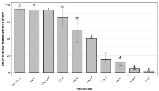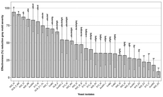 All the 31 new yeasts isolated from grape bunches of 7 native new table grape genotypes were tested through in vivo experiments to evaluate their effectiveness against the bunch rot caused by B. cinerea, assessed as a percentage reduction of disease severity, compared to the untreated control [36,62]. Among the 31 yeasts strains only 10, named ‘N22_I4’, ‘OLB_9_BR’, ‘N22_I3’, ‘N20_9B’, ‘AxAR4’, ‘S13_I6’, ‘OLB_9.1_VL’, ‘N22_I1’, ‘CxM5’ and ‘OLB_6’, showed an effectiveness greater than 60.0% and therefore selected for the subsequent analysis (Figure 2).
