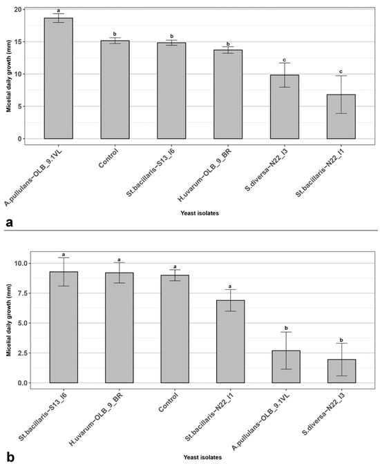 In vitro assays (a) Cellophane agar layer technique (CALt); (b) Sandwich dual culture for Volatile Organic Compounds (VOCs). In vitro antagonistic activity of yeast strains refers to mycelium daily growth of Botrytis cinerea. Plates without yeast strains were used as controls. Data are presented as the mean of five replicates with standard deviation (vertical bars). Columns labeled with different letters are statistically significant according to Tukey’s test (p < 0.05).