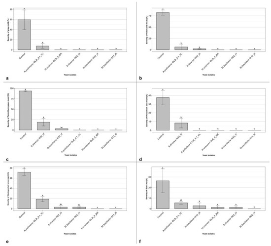We tested the isolate ability to be effective even when applied at lower concentrations of 1.5 × 105 CFU mL−1 against B. cinerea and other secondary rot agents, such as A. niger, A. alternata, P. glabrum, P. digitatum and Cladosporium spp. All the tested yeast strains confirmed their ability to significantly reduce the grey mold severity, even when applied at the concentration of 1.5 × 105 CFU mL−1. All the yeast strains significantly reduced the disease symptoms from a minimum of 91.30% (A. pullulans strains ‘OLB_9.1_VL’) to a maximum of 100% (all others) (Figure 5a). In the in vivo conditions realized in this experiment, the five yeast strains showed a different ability to reduce the disease severity caused by other secondary rot agents (Figure 5). All yeast isolates resulted effective against four over five tested secondary agents; and St. bacillaris, the S. diversa and the H. uvarum were able to significantly reduce the disease severity of black rot, caused by A. niger.