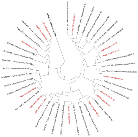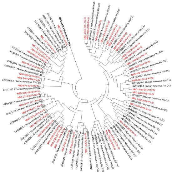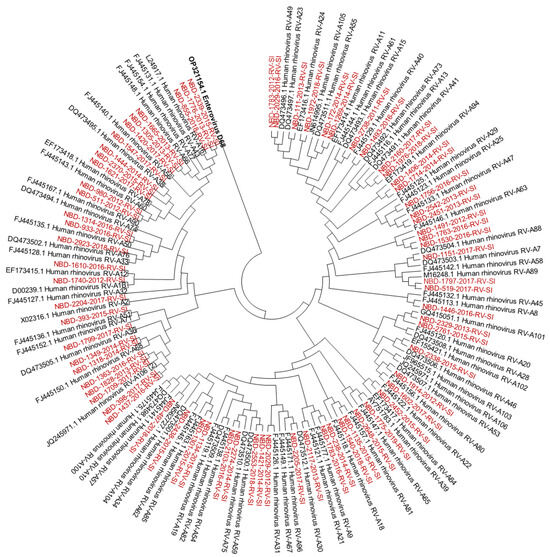 Phylogenetic tree (RV-A) constructed using the Neighbour-Joining algorithm, based on the VP4/VP2 region of RVs, including the selection of RVs genotyped in this study and RV-type reference strains defined by the Picornaviridae Study Group at ICTV [7]. Enterovirus EV-D68 (GenBank accession number: OP321154.1) was used as the outgroup. The RVs genotyped in this study are shown in red and labelled by the identifier NBD, followed by the laboratory protocol number, the collection year and the identifier RV-SI (NBD-PPPP-YYYY-RV-SI). All reference strains were retrieved from GenBank and are labelled by their GenBank accession numbers and RV type [30].