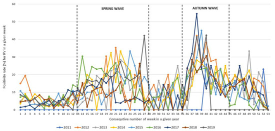 Seasonal circulation of RVs from 2011 to 2019 withspring and autumn waves. Black dashed lines show limits of spring waves (between weeks 13 and 28) and autumn waves (between weeks 35 and 45).