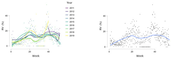 During the study period, RVs circulated throughout the entire year but with different intensities, showing regular spring and autumn seasonal waves (Figure 4, Figure 5 and Figure 6). The spring wave was longer, spanning over approximately 15 weeks (between weeks 13 and 28), with a relatively flat peak (Figure 4). The autumn wave was shorter, spanning over approximately 10 weeks (between weeks 35 and 45), and was characterised by a sharper peak than in spring (Figure 4). The generalised linear modelling identified the spring peak as occurring around week 20 and the autumn peak as occurring around week 40 of each year (Figure 5).