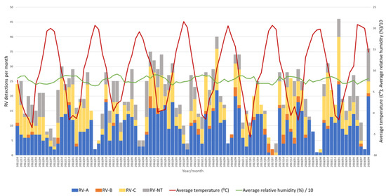 Number of RV-A, RV-B, RV-C and untyped RV (RV-NT) detections from week 40 in 2011 to week 39 in 2019 in relation to average temperature (°C) and average relative humidity (%).