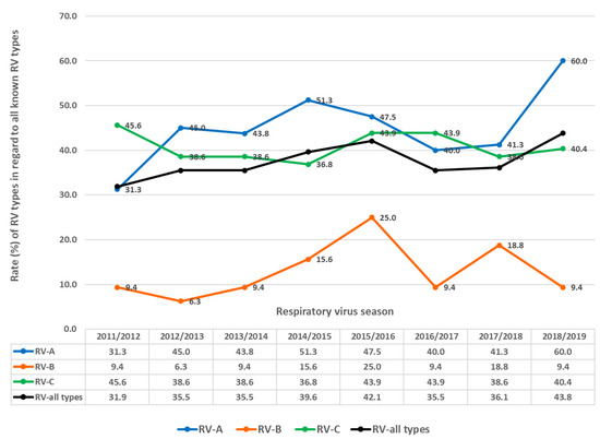 Rates (%) of different types regarding RV (all types), RV-A, RV-B and RV-C as the percentage of all known types of RV (all types), RV-A, RV-B and RV-C in investigated respiratory virus seasons.