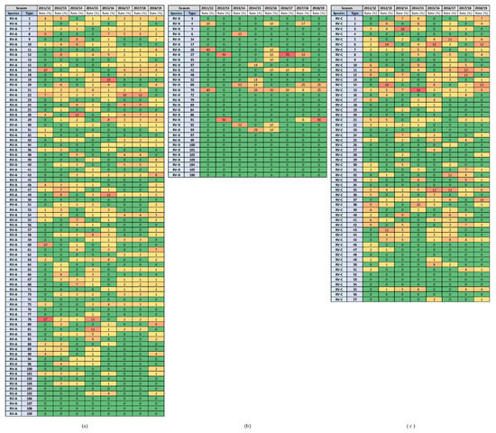 Heat diagrams of rates (%) of a given RV type as the percentage of all detected RV types of a given species in each respiratory virus season: (a) RV-A; (b) RV-B; and (c) RV-C. All known types of RV-A (80 types), RV-B (32 types) and RV-C (57 types) are present in the table. RV-B types were detected in low numbers. Red represents the highest rate, and green represents the lowest rate. A warm-to-cool colour scheme is used to show the decreasing rates.