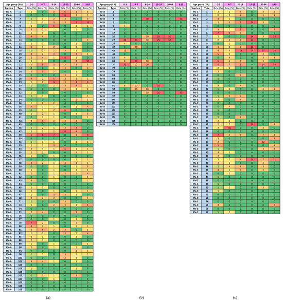 Heat diagrams of rates (%) of a given RV type as a percentage of all detected RV types of a given species in each age group (YA = years of age): (a) RV-A; (b) RV-B; and (c) RV-C. All known types of RV-A (80 types), RV-B (32 types) and RV-C (57 types) are present in the table. RV-B types were detected in low numbers. Red represents the highest rate, and green represents the lowest rate. A warm-to-cool colour scheme is used to show decreasing rates.