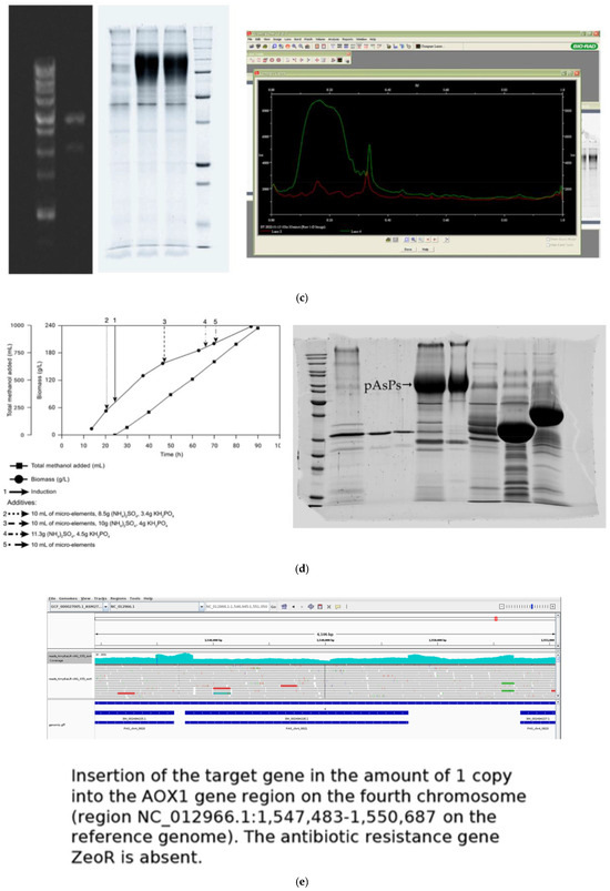 Currently, the expression system based on K. phaffii is one of the most popular for the production of heterologous proteins due to its GRAS status, rapid growth rate on various inexpensive substrates, including, in addition to methanol, glycerin, glucose, and sucrose, as well as the ability for high-cell-density fermentation [26,27]. Along with a low secretion of endogenous proteins, K. phaffii efficiently and with high yields produces and secretes heterologous proteins, thereby reducing the cost of purifying the latter [28,29,30]. To date, practical approaches have been developed and technological solutions have been described for the efficient expression of recombinant proteins in K. phaffii [31,32].