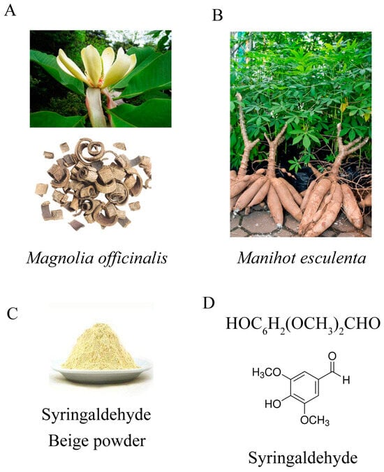 (A) Magnolia officinalis. [online image], 2018, 360doc. www.360doc.com/content/18/0429/09/42668302_749620463.shtml, accessed on 29 April 2018. (B) Manihot esculenta. [online image], 2018. http://www.360doc.com/content/22/0830/10/153132_1045851273.shtml, accessed on 7 December 2018. (C) SA, a light beige powder. [online image]. www.chemicalbook.com/SupplyInfo_1024189.htm, accessed on 16 March 2021. (D) The chemical structure of SA (3,5-dimethoxy-4-hydroxybenzaldehyde, C9H10O4).