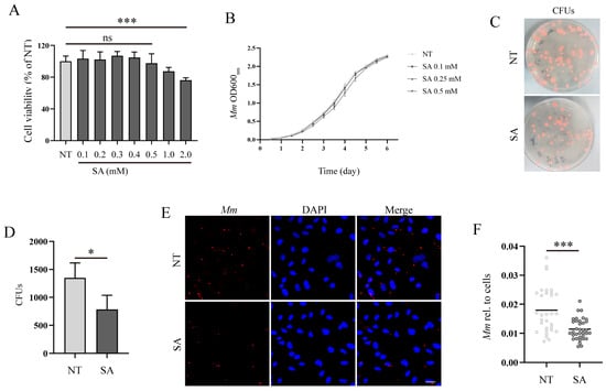 SA increases the resistance of lung epithelial cells to Mm infection. (A) The effect of various concentrations of SA on A549 cell viability; “ns” denotes “no significance” (n = 6). (B) The growth curve of Mm cultured with 0.1, 0.25, and 0.5 mM SA for 6 days (n = 3). (C,D) The CFU assays analyzing the effects of SA on Mm infection in A549 cells (n ≥ 9). (E) The efficiency of Mm infection in cells with pretreatment of 0.5 mM SA was determined by confocal microscope. Mm (red) represents tdTomato Mm, DAPI (blue) represents cell nuclei. Multiplicity of infection (MOI) = 10:1; the images are 20×; scale bar: 20 μm (n ≥ 31). (F) The Mm immunofluorescence intensity was quantified using ImageJ software; the results represent the area of Mm/the area of the cell nucleus (n ≥ 31). Means ± SEM; * p < 0.05 and *** p < 0.001.
