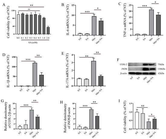 SA inhibits the inflammatory response induced by Mm infection. (A) The effect of different concentrations of SA on RAW264.7 cell viability; “no significance, ns” (n = 6). (B–E) qRT-PCR detection of the mRNA levels of IL-6, TNF-α, IL-1β, and IL-17A in RAW264.7 cells after Mm infection or the addition of 0.5 mM SA (n = 3). (F–H) Western blotting analysis of the effects of 0.5 mM SA on iNOS and COX-2 expression in macrophages after Mm infection (n = 3). (I) RAW264.7 cell viability, cells treated with Mm and 0.5 mM SA-pretreated Mm. Means ± SEM; * p < 0.05, ** p < 0.01, and *** p < 0.001.