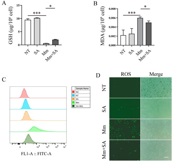 SA alleviates oxidative stress in Mm-infected macrophages. (A,B) The cellular levels of MDA and GSH in SA-treated and Mm-treated macrophages (n = 3). (C,D) The effects of SA on the production of ROS in Mm-infection-induced macrophages, determined using flow cytometry and fluorescence microscopy (n = 3); the images are 20×; scale bar: 50 μm. Means ± SEM; * p < 0.05 and *** p < 0.001.