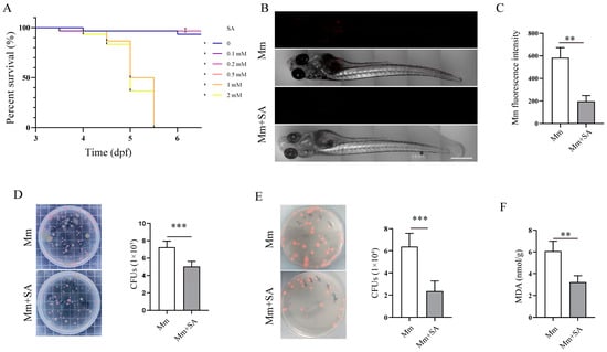 SA inhibits Mm proliferation and alleviates Mm-infection-induced oxidative stress in zebrafish. (A) The effects of different doses of SA on the survival of zebrafish larvae. (B) Imaging of Mm-infected zebrafish using laser scanning confocal microscope; the images are 10×; scale bar: 500 μm. (C) The statistics of B results. (n ≥ 6) (D) CFU assays analyzing the impact of 0.5 mM SA on the Mm load in zebrafish (n = 6). (E) CFU assays analyzing the effect of 0.5 mM SA on A549 cells after Mm infection. (F) The levels of MDA in the tissue homogenate of SA-treated and Mm-infected zebrafish (n = 3). Means ± SEM; ** p < 0.01 and *** p < 0.001.