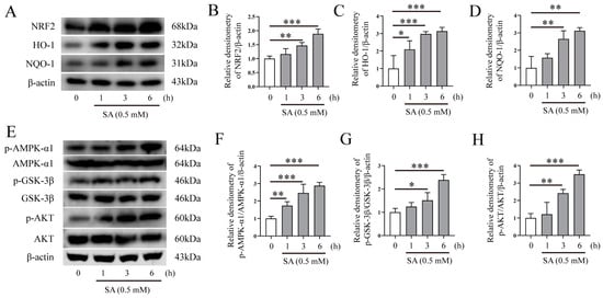 SA activates AMPK-α1/AKT/GSK-3β and NRF2/HO-1/NQO-1 signaling pathways. (A–D) Western blotting analysis of the effects of 0.5 mM SA on NRF2, HO-1, and NQO-1 protein expression in RAW264.7 cells (n = 3). (E–H) Western blotting analysis of the effects of 0.5 mM SA on the AMPK-α1, GSK-3β, and AKT signaling pathway in RAW264.7 cells (n = 3). Means ± SEM; * p < 0.05, ** p < 0.01, and *** p < 0.001.