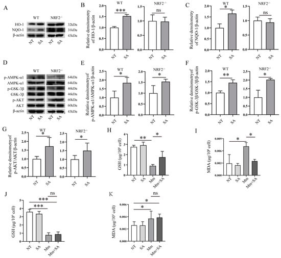 The antioxidative activity of SA depends on NRF2 in Mm-infected macrophages. (A–C) Western blotting analysis of the effects of 0.5 mM SA on the protein expression of HO-1 and NQO-1 in Mm-infected macrophages isolated from WT and NRF2−/− mice (n = 3). (D–G) Western blotting analysis of the effects of 0.5 mM SA on the AMPK-α1, GSK-3β, and AKT signaling pathway in Mm-infected macrophages isolated from WT and NRF2−/− mice (n = 3). (H,I) The levels of GSH and MDA in Mm-infected macrophages isolated from WT mice (n = 3). (J,K) The levels of GSH and MDA in Mm-infected macrophages isolated from NRF2−/− mice (n = 3). Means ± SEM; no significance, ns; * p < 0.05, ** p < 0.01, and *** p < 0.001.