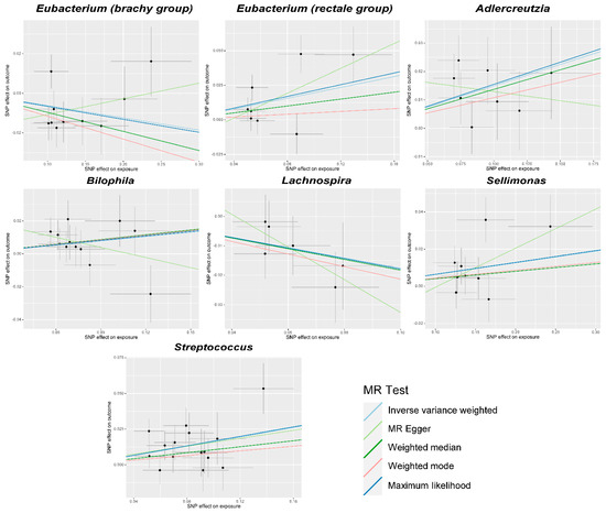For Bioage acceleration, Eubacterium (brachy group) showed suggestive protective association in the IVW analysis (β = −0.06, standard error(se) = 0.03, p = 0.036, q = 0.77); in the Weighted median analysis, the association was suggestive (β = −0.10, se = 0.04, p = 0.0089, q = 0.97); and in the Maximum likelihood analysis, the β was −0.07 (se = 0.03, p = 0.0170, q = 0.29) (Table 1 and Table S3). For Eubacterium (rectale group), there was a suggestive association in the IVW analysis (β = 0.20, se = 0.08, p = 0.0190, q = 0.48) and a causal association in the Maximum likelihood analysis (β = 0.21, se = 0.06, p = 0.0008, q = 0.03). Since IVW was the main analysis, Eubacterium (rectale group) was considered to have a suggestive association. Adlercreutzia was found to have a causal association after the FDR correction in the IVW and Maximum likelihood analyses (IVW, β = 0.15, se = 0.04, p = 0.0004, q = 0.03; Maximum likelihood, β = 0.16, se = 0.04, p = 0.0005, q = 0.03). It showed a suggestive causal association in the Weighted median analysis (β = 0.14, se = 0.06, p = 0.015, q = 0.97) but had an opposite direction of effect in the MR-Egger analysis (β = −0.06, se = 0.19, p = 0.75, q = 0.86). Bilophila was found to have a suggestive causal association in the IVW and Maximum likelihood analyses (IVW, β = 0.09, se = 0.04, p = 0.042, q = 0.77; Maximum likelihood, β = 0.09, se = 0.04, p = 0.041, q = 0.51). Lachnospira was found to have a suggestive protective association (IVW, β = −0.18, se = 0.07, p = 0.01, q = 0.43; Weighted median, β = −0.18, se = 0.08, p = 0.029, q = 0.99; Maximum likelihood, β = −0.18, se = 0.07, p = 0.011, q = 0.23). Sellimonas was found to have suggestive association (IVW, β = 0.06, se = 0.03, p = 0.019, q = 0.48; Maximum likelihood, β = 0.06, se = 0.03, p = 0.011, q = 0.23). Streptococcus was causally associated with Bioage acceleration (IVW, β = 0.16, se = 0.04, p = 0.0001, q = 0.01; Maximum likelihood, β = 0.17, se = 0.04, p = 0.0001, q = 0.01).