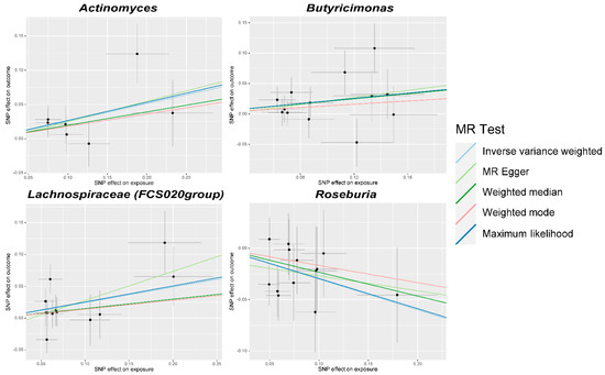Scatter plots for the causal association between gut microbiota and PhenoAge acceleration. SNP, single nucleotide polymorphism; MR, Mendelian randomization.