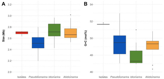 The genomes of the six isolates were assembled, each one of them in less than 25 scaffolds. Genome sizes were similar among them, from 2,634,306 to 2,725,130 bp, with a G+C content between 51.59 and 51.81 mol%. The species Pseudidiomarina andamanensis JCM 31645T, whose genome was also sequenced, had a genome size of 2,397,397 bp and a G+C content of 47.02 mol% (Table S3). The genomes of the new isolates showed a size slightly above the interquartile range for the other members of the genus Pseudidiomarina and a greater resemblance to the genomes of the species of the genera Idiomarina and Aliidiomarina (Figure 3A). Moreover, the G+C content was different from that of the other members of the family Idiomarinaceae, above the 51.00–46.93 and 50.82–46.34 mol% ranges for Idiomarina and Aliidiomarina, respectively. However, the G+C content fell still within the range for the species of Pseudidiomarina, 52.96–47.02 mol% (Figure 3B). The six isolates, along with the two species of the genus Pseudidiomarina with the highest G+C content, P. salinarum (52.96 mol%) and P. insulisalsae (52.34 mol%), were isolated from hypersaline environments. These habitats suffer from high solar radiation, and therefore, those higher G+C contents might be a genome adaptation in order to avoid the dimerization of thymine caused by UV radiation [73,74]. Further information on the genome sequences of the species of the family Idiomarinaceae included in this study is detailed in Table S3.