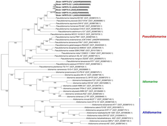 The GenBank accession numbers for the 16S rRNA gene sequences are MW776627 (1APP75-27aT), MW769704 (1APP75-32.1), MW776630 (1APR75-33.1), MW776629 (1ASP75-5), MW776631 (1ASP75-14), and MW776628 (1ASR75-15). The GenBank accession numbers for the whole genome sequences are JAGHRQ000000000 (1APP75-27aT), JAGGJB000000000 (1APP75-32.1), JAGGJD000000000 (1APR75-33.1), JAGGJE000000000 (1ASP75-5), JAGGJF000000000 (1ASP75-14), JAGGJC000000000 (1ASR75-15), and JAMZRF000000000 (Pseudidiomarina andamanensis JCM 31645T).