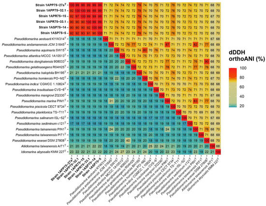 Digital DDH (lower triangle) and orthoANI (higher triangle) values (%) among the six isolates, the type strains of the species of the genus Pseudidiomarina, and the type species of the genera Aliidiomarina and Idiomarina. The six isolates showed values above the threshold for species delineation among themselves but below it with respect to the other species of the family Idiomarinaceae, indicating that they constitute a different separate species.