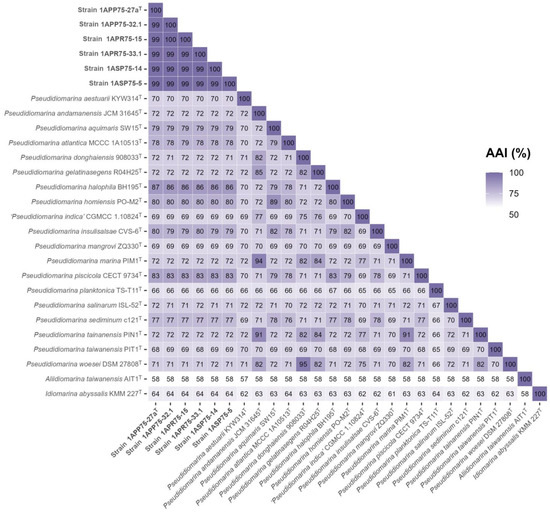 AAI values among the six new isolates, the species of the genus Pseudidiomarina, and the type species of the genera Aliidiomarina and Idiomarina. The six novel strains, together with the species of Pseudidiomarina, shared AAI values above the 65% cutoff for genus delineation.