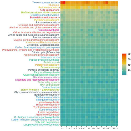 KEGG Orthology identifiers annotated for the genomes of the six new isolates, the representative genomes of the species of the genus Pseudidiomarina, and the type species of the genera Aliidiomarina and Idiomarina. The KEGG pathways are sorted according to their abundance in strain 1APP75-27aT and only the 50 most abundant ones are shown, grouped by KEGG categories: signal transduction (dark blue), energy metabolism (blue), translation (orange), nucleotide metabolism (yellow), carbohydrate metabolism (black), membrane transport (dark red), cell motility (light blue), amino acid metabolism (light red), cellular community (light green), glycan biosynthesis and metabolism (dark green), lipid metabolism (green), metabolism of cofactors and vitamins (pink), and biosynthesis of other secondary metabolites (purple). 1, strain 1APP75-27aT; 2, strain 1APP75-32.1; 3, strain 1APR75-33.1; 4, strain 1ASP75-14; 5, strain 1ASP75-5; 6, strain 1ASR75-15; 7, Pseudidiomarina aestuarii KYW314T; 8, Pseudidiomarina aquimaris SW15T; 9, Pseudidiomarina atlantica MCCC 1A10513T; 10, Pseudidiomarina donghaiensis 908033T; 11, Pseudidiomarina gelatinasegens R04H25T; 12, Pseudidiomarina halophila BH195T; 13, Pseudidiomarina homiensis PO-M2T; 14, Pseudidiomarina insulisalseae CSV-6T; 15, Pseudidiomarina marina PIM1T; 16, Pseudidiomarina piscicola CECT 9734T; 17, Pseudidiomarina plaktonica TS-T11T; 18, Pseudidiomarina salinarum ISL-52T; 19, Pseudidiomarina sediminim c121T; 20, Pseudidiomarina tainanensis PIN1T; 21, Pseudidiomarina taiwanensis PIT1T; 22, Pseudidiomarina woesei DSM 27808T; 23, Aliidiomarina taiwanensis AIT1T.