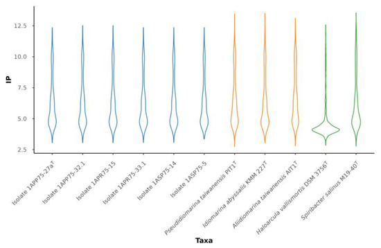 Violin plot representing the distribution of the isoelectric point (IP) of the six isolates (blue) and the type species of the genera within the family Idiomarinaceae (yellow), along with Haloarcula vallismortis DSM 3756T (GCF_900106715.1) and Spiribacter salinus M19-40T (GCF_000319575.2) used as references strains for salt-in and salt-out strategies, respectively (green).