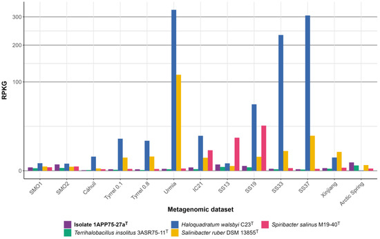 Genome recruitment (expressed as RPKG values) for the isolate 1APP75-27aT and four species of halophilic microorganisms with known distributions (i.e., the bacterial species Terrihalobacillus insolitus, Salinibacter ruber, and Spiribacter salinus, and the haloarchaea Haloquadratum walsbyi) against metagenomic datasets from different hypersaline environments: hypersaline soils from Odiel Saltmarshes Natural Area (SMO1, SMO2); a solar saltern from Chile (Cáhauil); hypersaline lakes from Australia (Tyrrell 0.1, Tyrrell 0.8); solar salterns located in Isla Cristina (IC21) and Santa Pola (SS13, SS19, SS33, and SS37), Spain; salt crust from the Qi Jiao Jing Lake in China (Xinjiang); and hypersaline sediments of the Arctic Spring (Arctic Spring). Squared root transformation was performed for the Y-axis in order to better visualize low values.