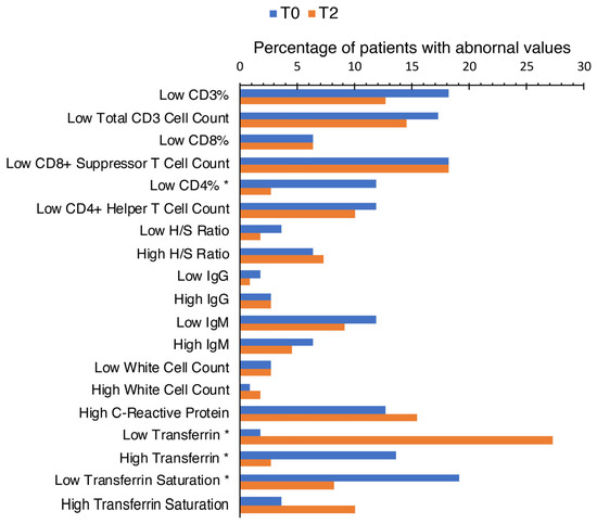 Changes in biomarkers over time points T0 and T2. This figure displays the proportion of patients exhibiting abnormal levels of immunological and iron metabolism biomarkers, specifically low CD4%, low transferrin, high transferrin, and low transferrin saturation at two distinct time points: baseline (T0) and follow-up (T2). Abnormal values are those falling outside of the traditional clinical reference range. A statistically significant difference in these percentages between the baseline and follow-up is noted. Biomarkers with a p-value below 0.05, indicating statistical significance as determined by Fisher’s exact test, are marked with an asterisk (*).