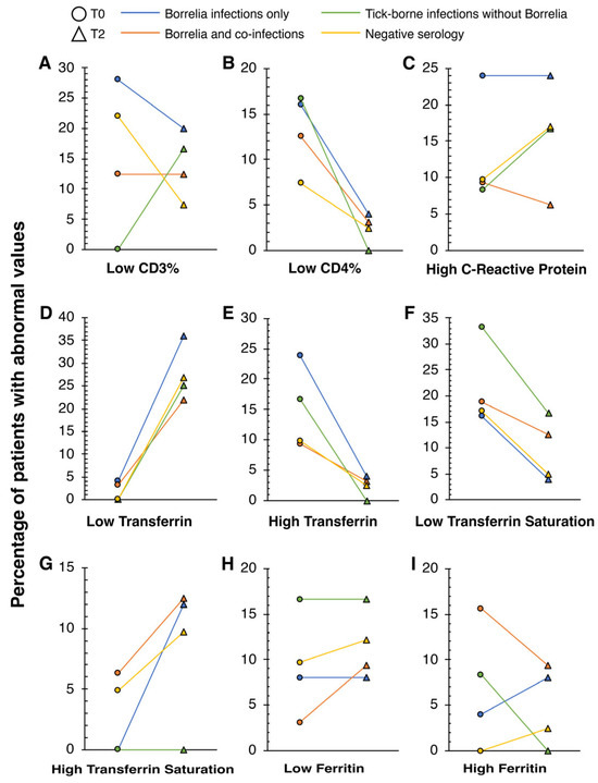 Comparative dynamics of immunological and inflammatory biomarkers in Borrelia-responsive patient groups from baseline (T0) to follow-up (T2). This figure illustrates the variation in the percentage of patients displaying clinically abnormal levels of various immunological and inflammatory biomarkers from T0 to T2. Patient groups are categorized based on their serological response: those with Borrelia-only infections (n = 25), those with Borrelia and other co-infections (n = 32), those with TBIs excluding Borrelia (n = 12), and those with negative serology (n = 41). The biomarkers analyzed include lymphocyte subsets (A) low CD3%, (B) low CD4%, acute-phase proteins, (C) high C-reactive protein, iron metabolism indicators, (D) low and (E) high transferrin, (F) low and (G) high transferrin saturation, and storage proteins (H) low and (I) high ferritin. Abnormal values are defined according to the traditional reference ranges established for each biomarker.