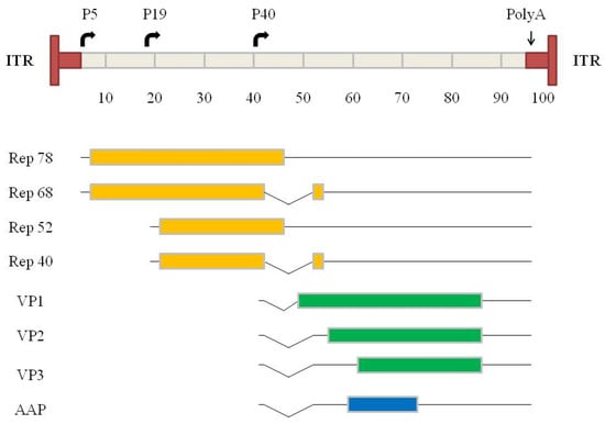 AAVs are small non-enveloped single-stranded (ss) DNA viruses with a diameter of 18–25 nm. They belong to the family Parvoviridae and are classified in the genus Dependovirus. This name is derived from the fact that for their complete replication the presence of a replicating helper virus is required. These can be adenoviruses or herpes viruses. Twelve strains have been isolated from humans and primates and have been characterized, and new serotypes and chimeras, respectively, are continuously discovered or developed [24]. All serotypes share a similar capsid structure, and their genomes have a similar size and organization, i.e., location of the open reading frames (ORF), promoters, introns, poly-adenylation site, and inverted terminal repeats (ITR) (Figure 1). The AAV genome contains two ORFs which encode the four regulatory proteins, the rep proteins (left part of the genome), and the three structural proteins, the Cap proteins (right part of the genome) [25,26]. A further ORF (an alternative ORF of the cap gene), encoding for the 23 kDa assembly activating protein (AAP), was described in 2010 [27]. The functions of these proteins are as follows: The two major rep proteins, Rep78 and Rep68, are involved in viral genome excision from the host chromosome, rescue, replication and integration [28], and also regulate gene expression from AAV and heterologous promoters [29,30,31]. The minor rep proteins, Rep52 and Rep40, are involved in accumulation and packaging of replicated ssDNA genomes [32]. The cap ORF is initiated at the p40 promoter and encodes the three structural capsid proteins VP1, VP2, and VP3, which form the capsid with a stoichiometry of 1:1:10 (vp1:vp2:vp3). All transcripts share the same polyadenylation signal. AAP is a critical scaffold that links VPs from their C terminus, promotes viral protein stability, and facilitates VP transport into the nucleus [27,33,34,35]. Finally, the ITRs which flank the AAV genome contain the only necessary regulatory cis-acting sequences required by the virus to complete its infection cycle, namely the origin of replication of the genome, the packaging, and the integration signals. Thus, the ITRs are the only genetic elements which have to be conserved in the vector constructs for transgene replication and packaging [36].
