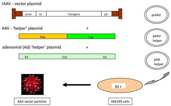 Figure 2. rAAV design and production principle (in a triple-transfection setting). AAV helper (rep, cap), rAAV vector, and the adenoviral helper (E2A, E4orf6, VA RNA genes) plasmids are brought into HEK293 cells (which are E1A, E1B positive) by Ca-phosphat or PEI transfection. Notes: prom—promoter; ivs—intervening sequence (e.g., intron); pA—polyA sequence.