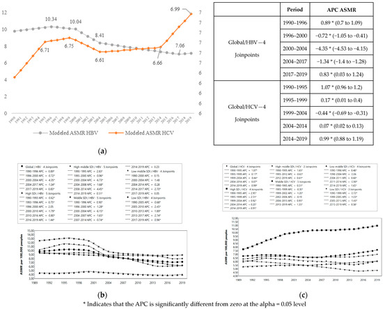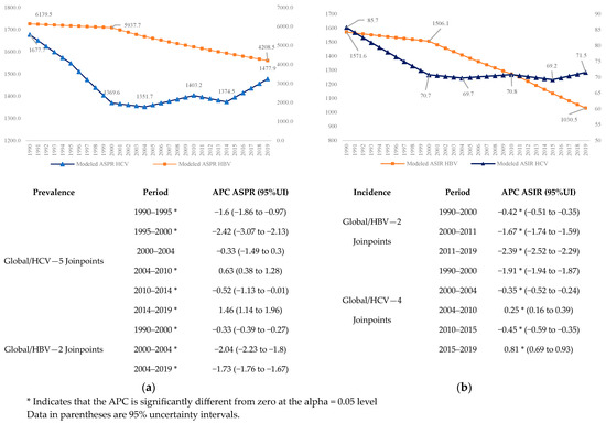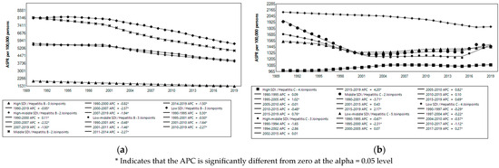 Through Joinpoint regression analysis (segmented regression model), we identified significant changing points in trends of ASPR, ASIR, and ASMR of viral hepatitis (HBV and HCV) for the analyzed period from 1990 to 2019. This model can find and identify points where significant changes occur (breakpoints) and where the dependent variable has changed significantly at different times.