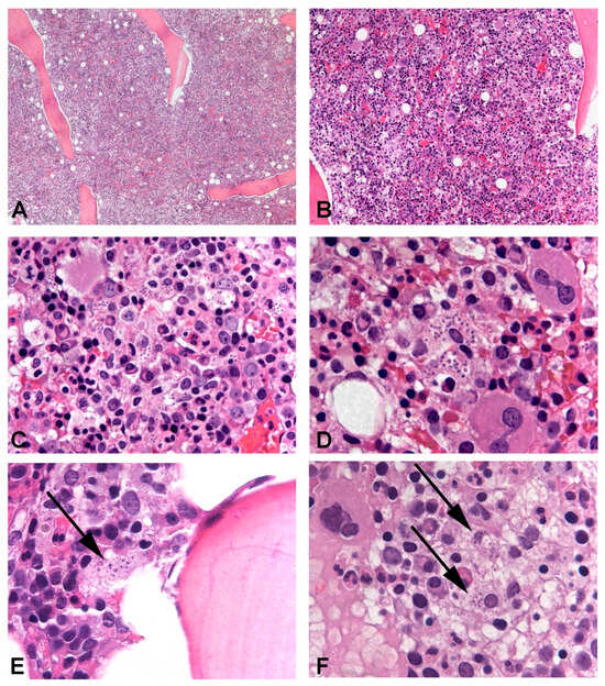 Leishmania amastigotes could be identified in the bone marrow trephine of all patients, in variable amounts. In Case 3, intertrabecular lacunae were hypercellular and numerous macrophages phagocyting significant numbers of amastigotes were evident and could be easily observed (A–D). In Cases 1 and 2, parasitic infection was more subtle with only a few amastigotes identifiable in rare macrophages ((E) and (F), respectively). In Case 1, cellularity was increased, while in Case 2, it was normal and hematopoietic progenitors of the three series displayed signs of abnormal maturation.