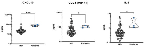 Two-dimensional dot-plot graphs of all patients (on the right of the graphs) vs. healthy donors of sera (on the left of the graphs, abbreviated as “HD”). All three patients presented elevated plasmatic levels of CXCL-10, CCL-4, and IL-6 when compared to the healthy controls (graphs from left to right). * indicates a statistically significant result (0.05 > p-value > 0.001), while *** evidences a strong statistical significance (p-value < 0.001).