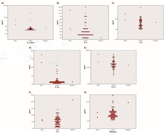 Two-dimensional dot-plot graphs comparing healthy controls to acute-phase or recovery-phase cases. Images (A–E) show that the acute-phase patients (on the left) presented higher concentrations of IL-1α, IL-4, IL-5, IL-10, and IL-12, respectively, while the recovery patient (on the right) can be assimilated to the healthy controls (in the middle). Images (F,G) represent TNF-α, and IL-7 that presented higher values in the convalescent patient (on the right) compared to the healthy controls (in the middle) and the acute-phase patients (on the right). All cytokines are expressed in pg/mL.