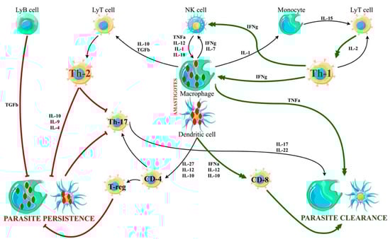 The main pro-inflammatory cytokines against VL, which mediate macrophage activation and intracellular parasite clearance, are represented by CXCL-10, IL-2, IL-8, IL-12, IL-15, IL-17, IL-22, and TNF-α. These molecules are responsible for naive T-cell polarization towards a Th1 phenotype with the production of IFN-γ, eventually killing the parasite.